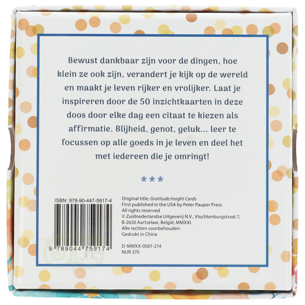 Bewust dankbaar zijn voor de dingen, hoe klein ze ook zijn, verandert je kijk op de wereld en maakt je leven rijker en vrolijker. Laat je inspireren door de 50 inzichtkaarten in deze doos door elke dag een citaat te kiezen als affirmatie. Blijheid, genot, geluk….. leer te focussen op alle goeds in je leven en deel het met iedereen die je omringt!
